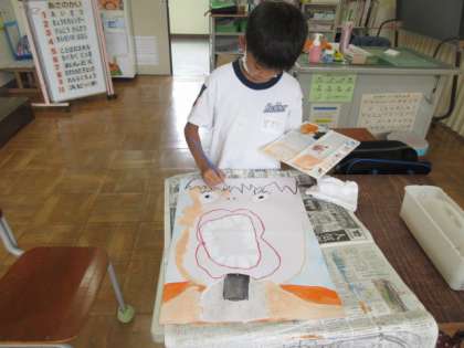 おにぎりを食べている自分を描いています。お腹がペコペコで、我慢できない様子が伝わってきます。