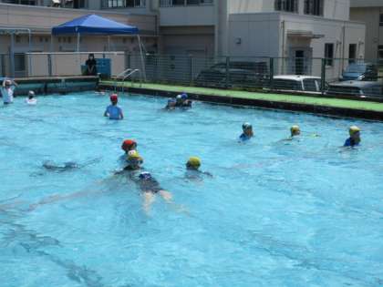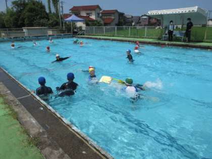 夏休み初日、好天にも恵まれ、プールで楽しんでいます。更衣室でおしゃべりをしない、換気をしかっりと行う、必要に応じてマスクを着用する、手指消毒・うがいをするなど、感染症対策をしっかりして、プールに参加しましょう。