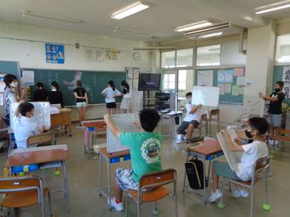 夏休みの思い出や頑張ったことなどをクイズ形式で発表するクラスも見られました。
