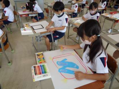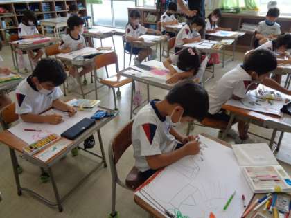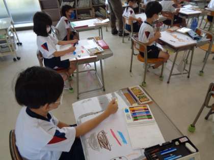 夏休みの楽しかった思い出を、のびのびとした絵に描いています。