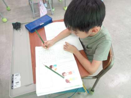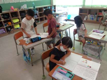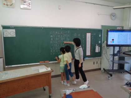 マス目に隠れている言葉をたくさん見付け、発表しています。初めて聞く言葉の意味を、見付けた友達に確かめていました。