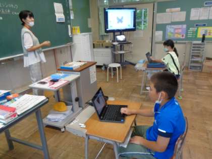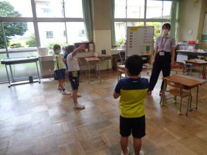 動画を見ながら、昆虫の体のつくりについて確認しています。理科アシスタントとして来ていただいている学生の方に、自分たちの踊りも見ていただきました。