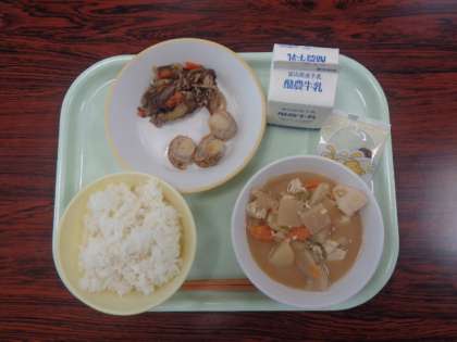 今日の献立は、ご飯 ごまけんちん もずくのチャプチェ ホタテの香味焼き 黒糖大豆 牛乳 でした。