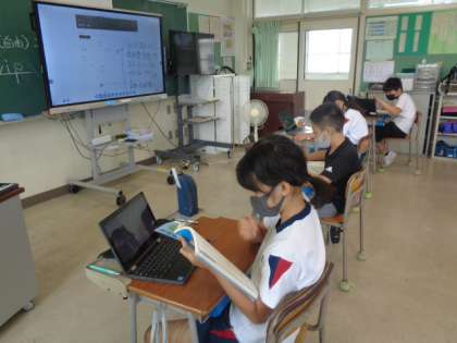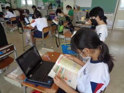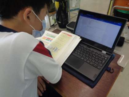 先生が作成したテスト問題を教科書をしっかり読みながらPCに書き込んでいます。とても集中しています。