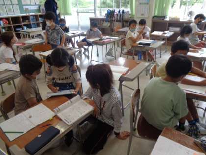 友達の考えを自分の言葉でもう一度話したり、意味の分からないことを互いに聞き合ったりして、理解を深めています。