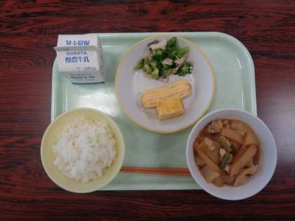 今日の献立は、ご飯 大根と鶏肉の煮込み 厚焼き卵 ブロッコリーとエリンギのソテー 牛乳 でした。