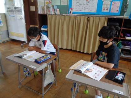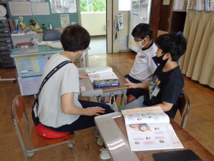 読み物資料を交代で読んでいます。相手が聞きやすいようにゆっくり丁寧に読んでいます。