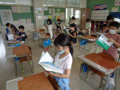 「くじらぐも」の場面ごとに音読練習をしています。登場人物やくじらさんの気持ちになって読み方を工夫しています。