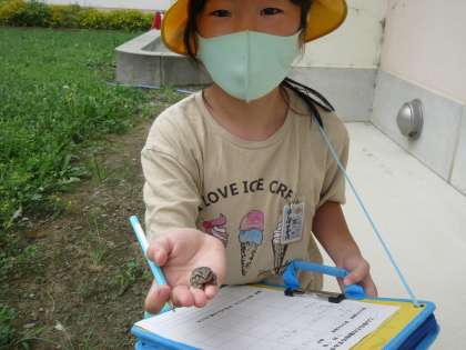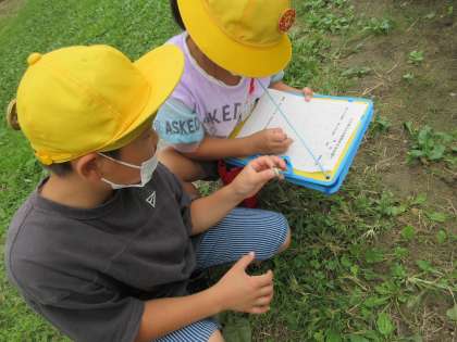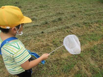 学校の畑や中庭で、昆虫や生き物を探しました。子供たちは、虫の声に耳を澄ませたり、トンボやバッタを網で捕まえたりしながら楽しく活動していました。