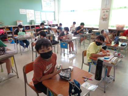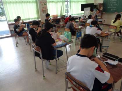 雨天のため、延期になったチャレンジ陸上。6年生は教室でおいしいお弁当です。