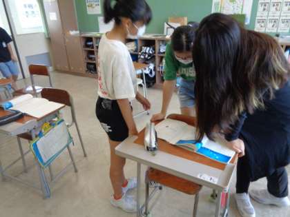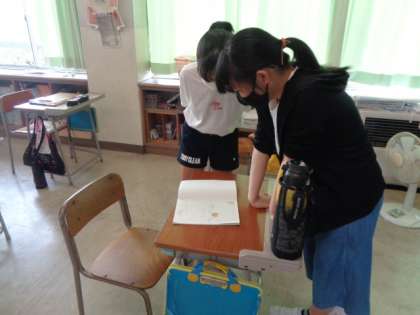 物語文「やまなし」の2つの場面を図や絵で描写したお互いのノートを見て、気付いたこと話し合っています。