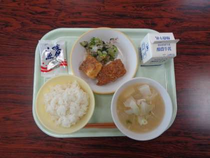 今日の献立は、ご飯 揚げ出し豆腐のごまかけだれ 豚汁 ゆかりあえ 味付け小魚 牛乳 でした。