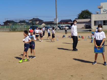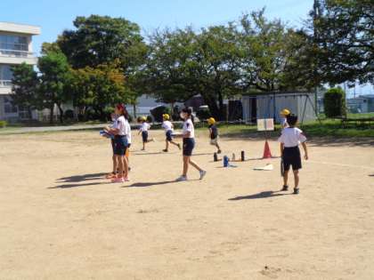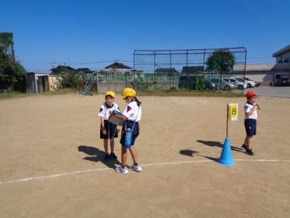 下学年の人たちは上学年の人たちに記録を測ってもらいました。三角コーンに各団の走った距離を表す数字が書かれており、子供たちは、自分の走った距離を確認しています。