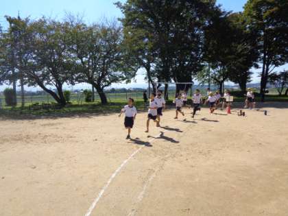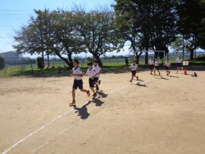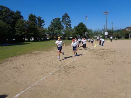 今日は測った自分たちの記録をもとに、練習を繰り返して、走る力を高めていきます。練習では、八幡の森を走るコースも予定しています。
