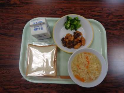 今日の献立は、食パン 鶏肉とレバーのマーマレードソースからめ コーンと卵のスープ ゆでブリッコリー 牛乳 でした。