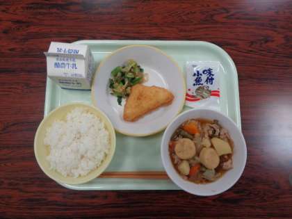 今日の献立は、ご飯 肉じゃが はんぺんプライ はりはり和え 味付け小魚 牛乳 でした。