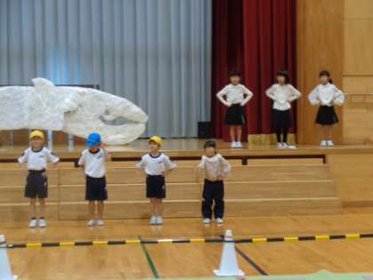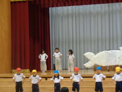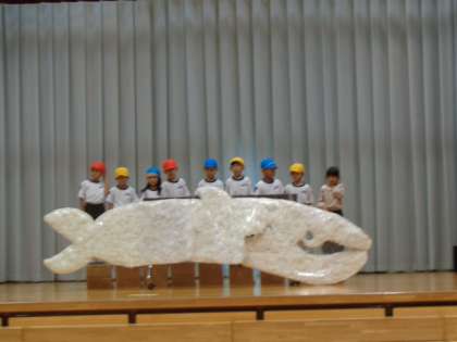 ステージ上に大きな「クジラぐも」も登場し、子供たちの演技を見守っています。