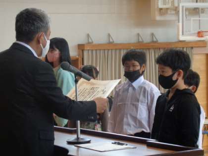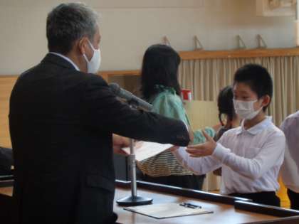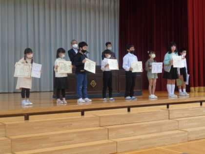 2学期初めての受賞伝達式。夏休みに出展した作品を中心に、優れた成績を収めた8人が校長先生から賞状を受け取りました。おめでとうございます。