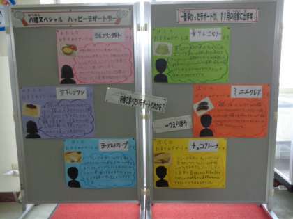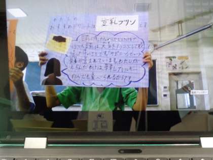 スペシャルデザートの6つ紹介動画が各学級で流されました。各自が一番に食べたいと思ったデザートを選んで、ファームで投票します。栄養や色合い、食感や健康など、給食委員の人たちが考えた動画、すてきな内容でした。今日が投票締め切り日。結果発表は14日(金)に行われます。楽しみです。