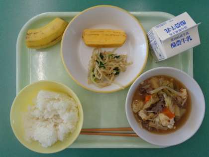 今日の給食は、ご飯 すき焼き  厚焼き卵  もやしのおひたし  バナナ  牛乳 でした。