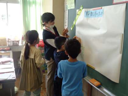 家の人や先生方にイ、そのンタビューしながら調べた「よく買い物へ行く店」について発表しました。よく行く理由には様々な理由があることが分かりました。今後もよく行く店の工夫や理由についてもっと調べていきます。