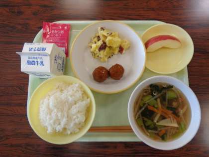 今日の献立は、ご飯 はるさめスープ ミートボール チーズおさつ りんご しそかつおふりかけ 牛乳 でした