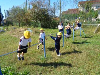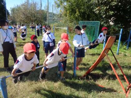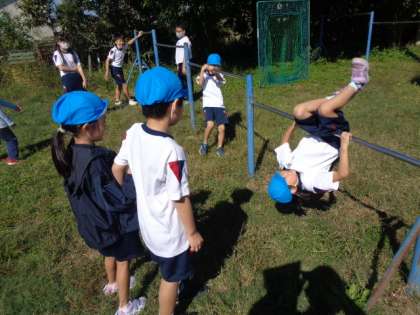 1年生が5年生に教わりながら鉄棒運動を行い、いろいな技に挑戦していました。