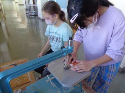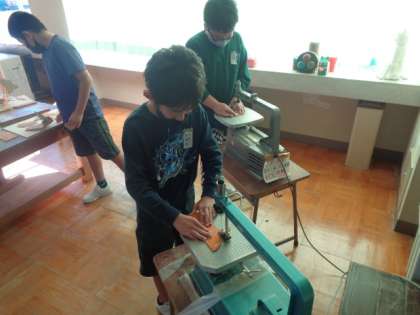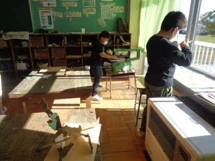 糸鋸を巧みに扱い、立体的なパズルを作っています。積み重ねられた作品は、素敵なものばかりです。