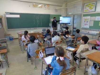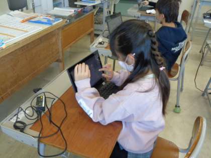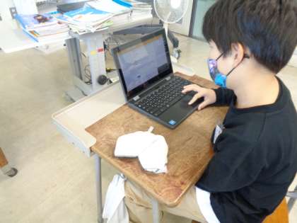 昨日行われたRun Run記録会の振り返りをしています。活動内容や自分のがんばりなどについて、PCに入力しています。