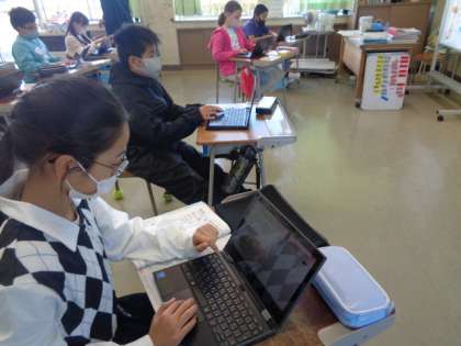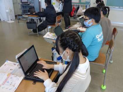 道具箱の整理の仕方について話し合っています。見やすさ使いやすきれいさ様々など、きれいにするためのポイントが発表され、自分たちの「整とん術」について考えています。話合いでの気付きは、PC入力です。