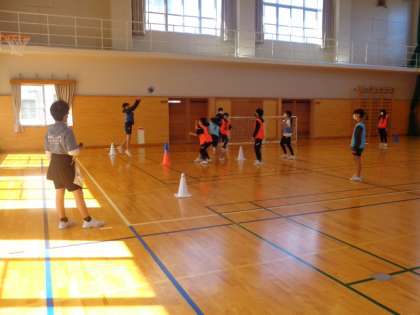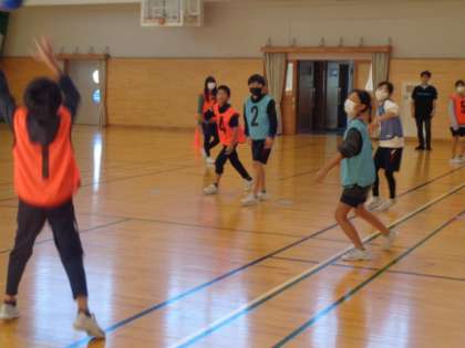 バンドボールのゲームをしています。審判は、セルフジャッジ。グループ内で声をかけ合いながら、ゲームを楽しんでいます。