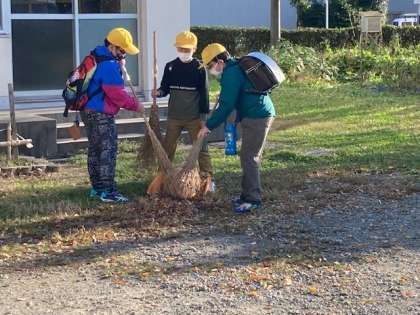 委員の子供たちが中心となり、登校した子供たちが玄関前の落ち葉拾いを行っています。