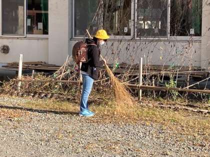 委員の子供たちが中心となり、登校した子供たちが玄関前の落ち葉拾いを行っています。