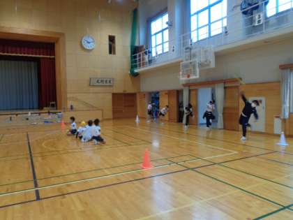 第2回の体力テストに向けて、各団に分かれ3つの種目にを中心に体力作りを行いました。体育館では、ソフトボール投げと握力向上のための練習です。ソフトボール投げは、挑戦する距離を各自が決め、的を目がけて投げる練習をしました。上学年には、ギャラリーを越えてしまう人も。
