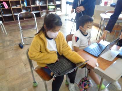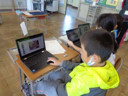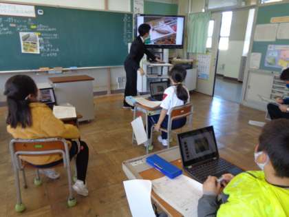 「スーパーマーケットの販売の工夫について、見学したことをもとに話し合いました。一人一人がたくさんの視点で調べ、写真データを用いながら発表していました。、