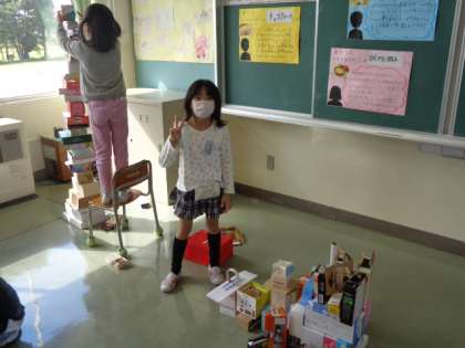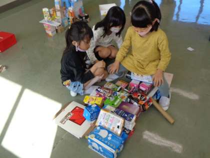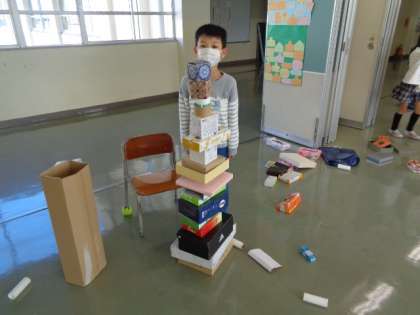 いろいろな大きなや形をしている箱を積み重ね、造形遊びを楽しんでいます。