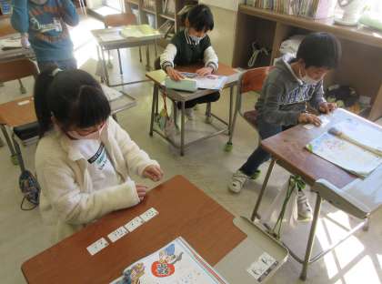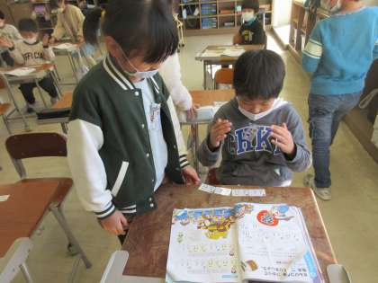 音楽では、繰り返しのリズムを楽しむ学習をしています。リズムカードを使って、オリジナルの繰り返しのリズムを作りました。