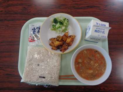 今日の献立は、ソフト麺の肉味噌 大学芋 花野菜サラダ 味付け小魚 牛乳 でした。