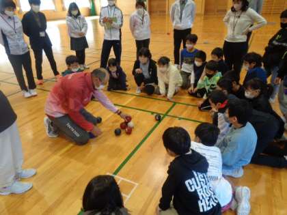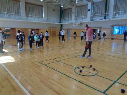 富山人権擁護委員と富山ボッチャクラブの皆様のお招きし、ボッチャ体験教室を行いました。初めて体験するボッチャ。始めにボールの投げ方やルールについて教わり確認しました。