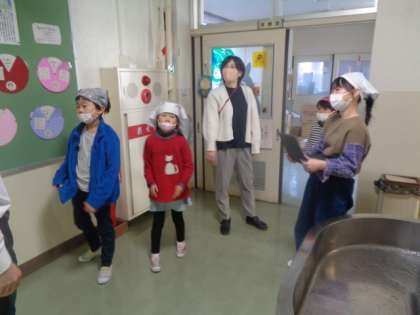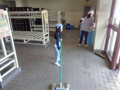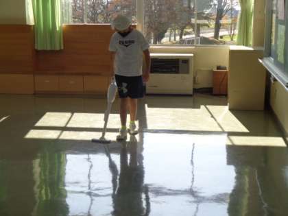 今日から縦割り掃除の担当場所が変わり、リーダーがPCを見せながら担当の仕事の内容を説明した後、早速 掃除をスタートさせています。。