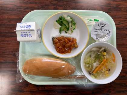 今日の献立は、 米粉コッペパン  しいらのイタリアンえごまソースかけ  かぶのゆずサラダ  はくさいスープ  ラフランスヨーグルト  牛乳  でした。