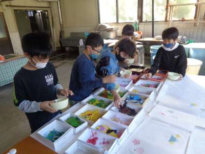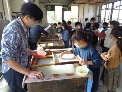 桂樹舎で紙すき体験をしました。のりのような白い物が紙になっていくことに驚いていました。出来上がった和紙は、記念に残る物となりました。