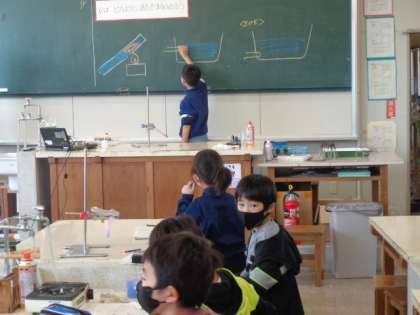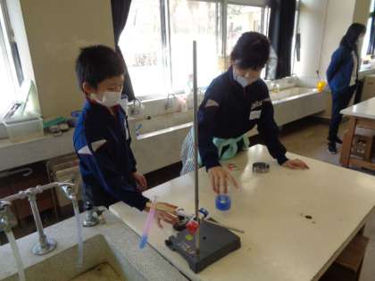 水がどのように温められるのか、温水と冷水に分けた色水の動きを確かめながら考えました。