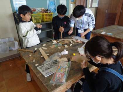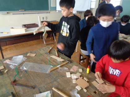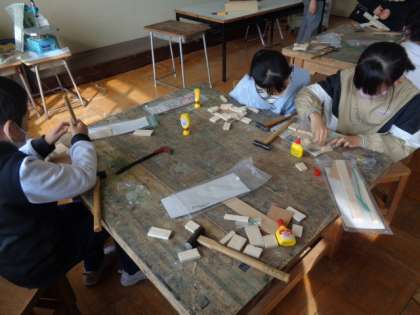 切り取った木の材料を組み合わせ、壁掛けを作っています。