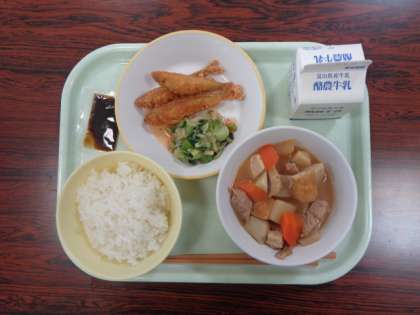 今日の献立は、ご飯  里芋と厚揚げのうま煮  わかさぎのフリッター  梅肉和え  のりの佃煮  牛乳  でした。