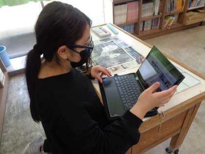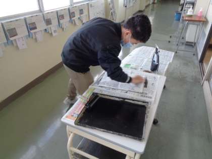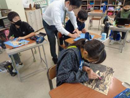 2色刷の版画に挑戦しています。彫る方向や太さを考え、色の組み合わせのよさも確認しながら製作活動に取り組んでいます。