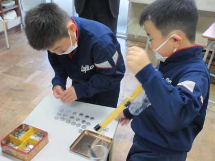 子供たちは自作の天秤を使いながら物の重さを比べたり、その重さが1円玉何枚分になるのかを調べたりしました。