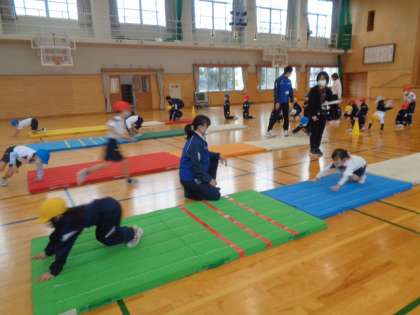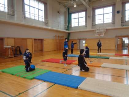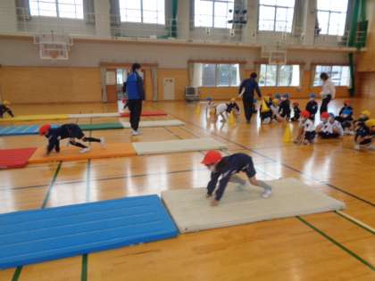 外部講師の方をお招きし、マット運動の指導を受けました。1・2年生は、マットの上でできるいろいろな動きの練習で体をほぐした後、前転後転にチャレンジです。手や頭の着き方を教わりながら練習し、よりきれいな姿勢で回ることができるようになってきました。