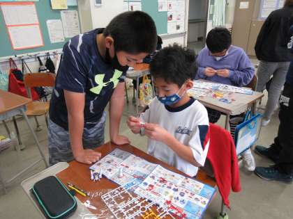 12月1日の社会の時間に、「これからの工業生産」の学習で、バンダイナムコさんからいただいたガンダムのキットを使って、日本の工業生産のよさについてみんなで考えました。一人一人が丁寧にキットを組み立て、プラモデルをつくることができました。