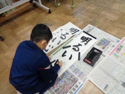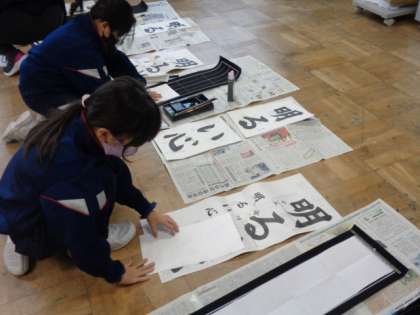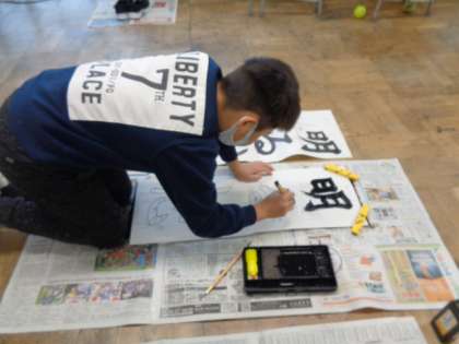 初めて床の上での練習です。全体を見渡し、中心線や字の大きさを確認しながらの練習です。